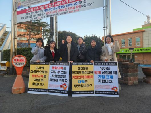 이 같은 현실을 알리기 위해 서천초등학교병설유치원 교직원들은 지난달 29일부터 이달 16일까지 서천교육지원청 앞에서 피켓 시위를 진행했다. 퇴근 시간과 점심시간을 활용해 현장의 목소리를 전달한 이들의 피켓에는 '교사의 마음만으로는 통합교육을 지킬 수 없습니다', '유아는 함께 성장할 때 가장 크게 자랍니다' 등의 문구가 적혔다.