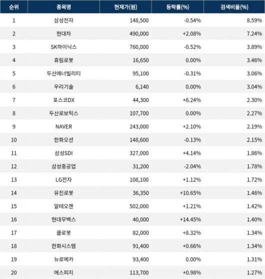 이어 현대차(005380)가 검색비율 2위를 기록하며 2.08%의 상승세를 기록하고 있다. 검색비율 3위의 SK하이닉스(000660)는 0.52% 하락하며 출발하는 모습이다. 검색비율 4위 휴림로봇(090710)은 개장 초반부터 0%의 등락률로 보합세를 유지하고 있다. 검색비율 5위 두산에너빌리티(034020)는 0.31% 하락하며 큰 움직임을 보이지 않고 있다.