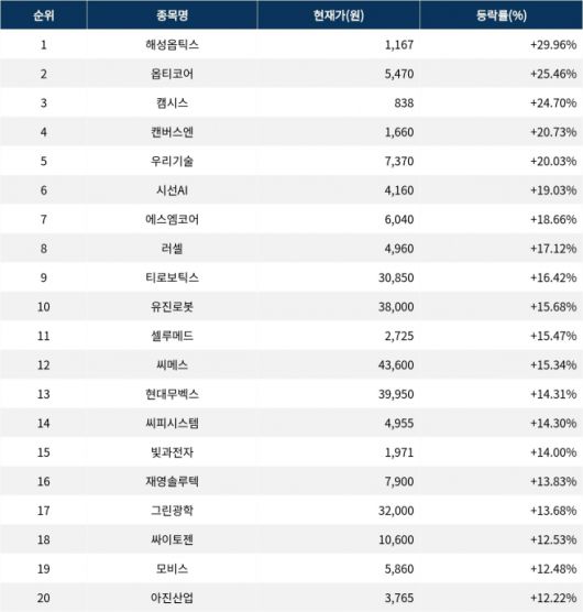 이어 상승률 2위 옵티코어(380540)는 현재가 5,470원으로 주가가 25.46% 폭등하고 있다. 상승률 3위 캠시스(050110)는 현재 838원으로 24.70% 폭등하며 강력한 상승세를 보이고 있다. 상승률 4위 캔버스엔(210120)은 20.73% 급등하며 1,660원에 거래되고 있다. 상승률 5위 우리기술(032820)은 20.03%의 상승세를 타고 7,370원에 거래되고 있다.