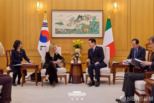 [서울=뉴스핌] 이재명 대통령이 지난 19일 오전 청와대에서 한-이탈리아 정상회담을 위해 한국을 찾은 조르자 멜로니 이탈리아 총리와 소인수 회담을 하고 있다. [사진=청와대] 2026.01.20 photo@newspim.com