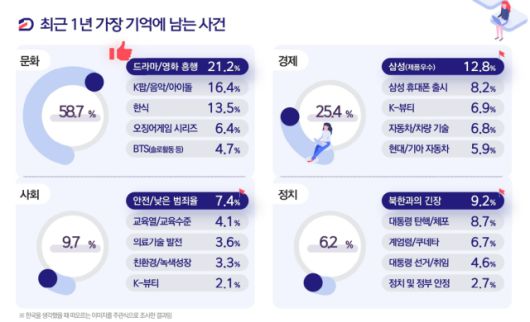 한국에서 유학중인 유학생, 외신기자, 해외 거주 외국인 70여명 등 한국 정보 고관여자 등을 대상으로 실시한 국가이미지 조사 관련 심층 면담에 따르면, 최근 1년 세계인이 한국을 바라보는 틀이 확장됐다. 과거에는 안보 문제나 아이돌, K팝 등을 중심으로 한국을 인식했다면, 최근 1년 사이에는 문화·경제·사회·정치 전반으로 관심이 넓어졌다.