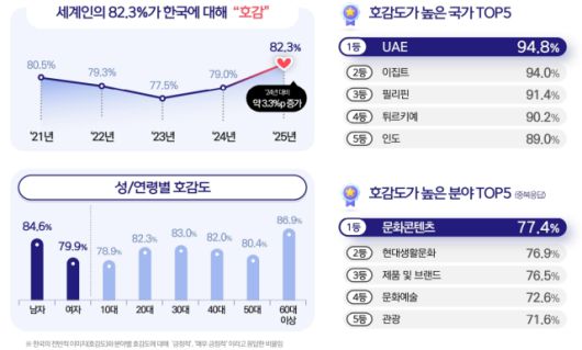 문화체육관광부(장관 최휘영)가 전세계 26개국 1만 3000명을 대상으로 지난해 10월 1~31일 시행한 ‘2025년도 대한민국 국가이미지 조사 결과’ 발표에 따르면 외국인의 한국에 대한 호감도는 전년 대비 3.3%포인트 상승한 82.3%로, 2018년 조사를 시작한 이래 최고 수준을 기록했다. 연도별 국가이미지 조사 결과는 2018년 78.7%, 2019년 76.7%, 2020년 78.1%, 2021년 80.5%, 2022년 79.3%, 2023년 77.5%, 2024년 79.0%에 이어 지난해 82.3%였다.