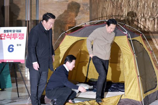장 대표는 통일교 게이트와 민주당 공천뇌물 의혹에 대한 이른바 ‘쌍특검’ 수용을 촉구하며 국회 로텐더홀에서 단식 투쟁을 6일째 이어가고 있다.