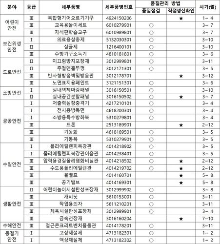 안전관리물자는 국민안전 확보에 영향이 큰 품목을 지정해 중점 관리한다. 지난해 등급을 기존 2개에서 3개로 세분화해 중요도가 높은 상위등급부터 점검주기를 단축해 나갈 계획으로, 올해 Ⅰ등급 전 품목 등 26개 물품을 선정해 품질점검을 시행한다.