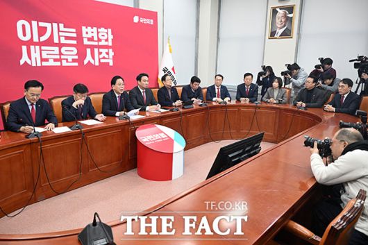 [더팩트ㅣ국회=남용희 기자] 송언석 국민의힘 원내대표(가운데)가 20일 오전 서울 여의도 국회에서 열린 원내대책회의에서 발언을 하고 있다.