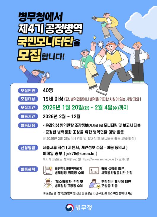 아시아투데이 지환혁 기자 = 병무청이 공정한 병역이행 문화 확산을 위해 온라인상 병역면탈 조장정보 게시글을 모니터링할 '제4기 공정병역 국민모니터단'을 모집한다.