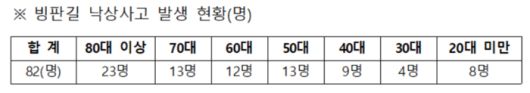 원주소방서에 따르면, 올해 1월 1일부터 19일까지 출동한 1,156건의 구급출동 현황을 분석한 결과, 빙판길 낙상 사고로 82명의 환자가 병원 등으로 이송되었다. 성별 분포로는 남성 34명, 여성 48명으로 집계되었고, 나이대별로는 80대 이상이 23명으로 가장 많았고, 70대 13명, 60대 12명으로 60대 이상의 연령대가 절반 이상을 차지해 빙판길 미끄러짐 사고에 취약한 것으로 나타났다.