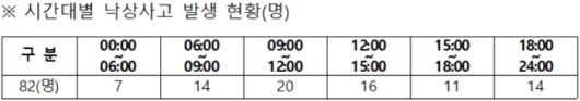 사고 시간대별로 보면, 아침 6시부터 오후 3시까지 출근시간을 포함해 주로 시민들이 야외에서 활동하는 시간에 낙상사고가 50건으로 전체 사고의 60%를 차지했다.