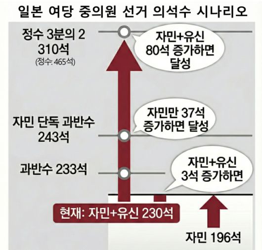 전문가들은 다카이치 총리가 내세운 ‘정치 안정’을 실현하기 위해서는 단순 과반을 넘어 참의원(상원)의 여소야대 국면을 돌파할 수 있는 압도적 승리가 필요하다고 분석한다. 현재 참의원 과반 미달 상태를 상쇄하려면 중의원에서 야당의 반대에도 법안을 재가결할 수 있는 ‘3분의 2’ 의석이 필요하지만, 이를 위해서는 80석을 추가해야 해 현실적인 장벽이 높다. 유신회의 도움 없이 자력으로 법안을 추진할 수 있는 자민당 단독 과반을 위해서도 37석을 더 확보해야 한다.