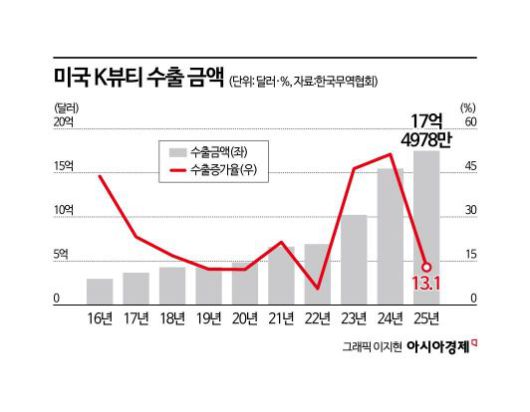 K뷰티 수출 역시 성장세를 보였다. 지난해 K뷰티의 미국 수출액은 17억4978만달러(약 2조5800억원)로 전년 대비 13.1% 증가하며 역대 최대치를 기록했다. 미국은 중국을 제치고 K뷰티 최대 수출국으로 올라섰다.