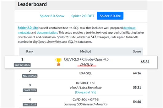 [파이낸셜뉴스] 인공지능(AI) 스타트업 다큐브가 국제 Text-to-SQL 성능 평가 지표 ‘Spider 2.0’ Lite 부문에서 세계 1위를 차지했다고 20일 밝혔다.