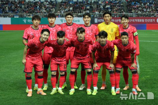 [대전=뉴시스] 조성우 기자 = 14일 오후 대전 유성구 대전월드컵경기장에서 열린 축구 국가대표팀 평가전 대한민국과 볼리비아의 경기, 한국 베스트11이 기념촬영을 하고 있다. 2025.11.14. xconfind@newsis.com |