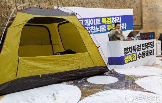 [서울=뉴스핌] 윤창빈 기자 = 통일교·공천헌금 '쌍특검'을 요구하며 엿새째 단식을 진행 중인 장동혁 국민의힘 대표가 20일 서울 여의도 국회 로텐더홀 농성장에서 물을 마시고 있다. 2026.01.20 pangbin@newspim.com