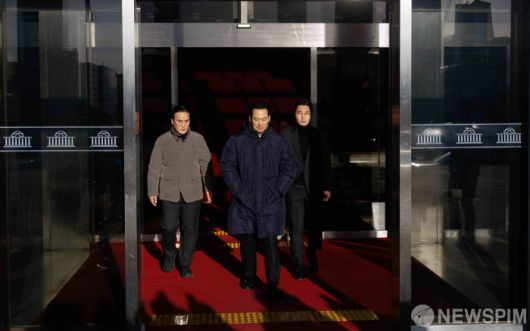 [서울=뉴스핌] 윤창빈 기자 = 통일교·공천헌금 '쌍특검'을 요구하며 엿새째 단식을 진행 중인 장동혁 국민의힘 대표가 20일 서울 여의도 국회 로텐더홀 농성장에서 잠시 나와 박준태 비서실장, 김종양 의원의 부축을 받으며 나서고 있다. 2026.01.20 pangbin@newspim.com
