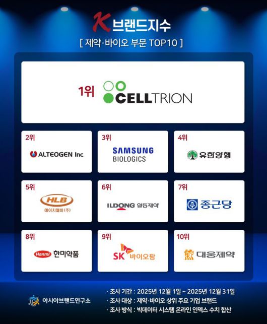 K브랜드지수 제약·바이오 부문은 셀트리온이 1위를 수성한 가운데, 알테오젠(2위), 삼성바이오로직스(3위), 유한양행(4위), HLB(5위), 일동제약(6위), 종근당(7위), 한미약품(8위), SK바이오팜(9위), 대웅제약(10위) 등이 TOP10에 이름을 올렸다.