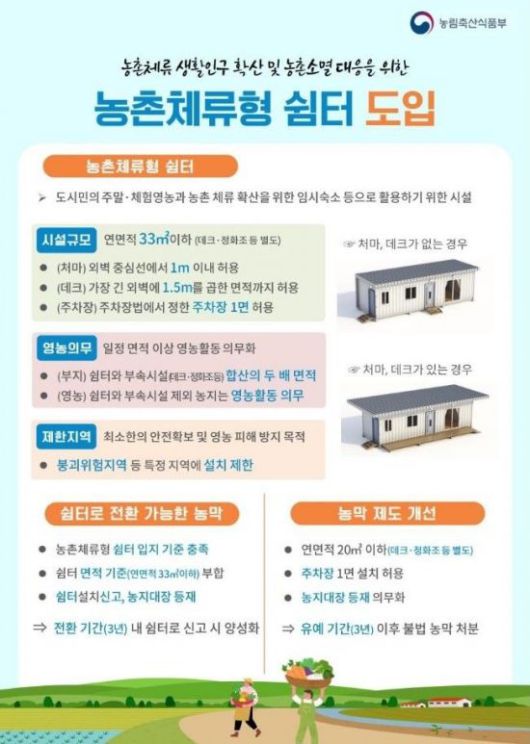 농촌 체류형 쉼터는 농지 내 총면적 33㎡ 이내에서 설치할 수 있으며, 주차공간과 데크, 정화조 등 부대시설 설치가 가능하다. 농림축산식품부 지침에 따라 현황도로 등에 연접해 소방차 진·출입이 가능해야 하며, 소방 및 안전기준 강화를 위해 소화기와 감지기 등 화재 안전시설 설치를 의무화하고 재난 위험 지역 내 설치는 제한한다.