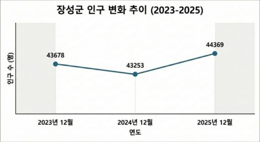 전남 장성군이 20일 지방 소멸과 인구 감소 우려를 해소하는 의미있는 통계를 발표했다. 장성군에 따르면 지난해 12월 집계된 장성군의 인구는 4만4369명으로 1년 전보다 1116명 증가했다.