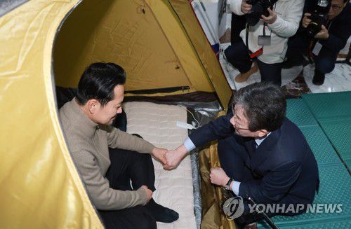 (서울=연합뉴스) 신현우 기자 = 더불어민주당에 통일교·공천헌금 '쌍특검' 수용을 요구하며 엿새째 단식 농성 중인 국민의힘 장동혁 대표가 20일 국회 로텐더홀 단식 농성장을 찾은 유승민 전 의원과 대화하고 있다. 2026.1.20