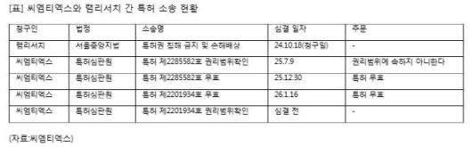 씨엠티엑스는 각각의 특허에 대해 권리범위확인심판 및 특허무효심판을 특허심판원에 청구해 대응해 왔다. 특히 지난해 7월 특허 제2285582호에 대한 권리범위확인심판에 이어 최근 2건의 특허무효심판을 모두 승소함으로써 향후 소송전에서 유리한 고지를 점하게 됐다.