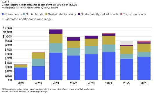 또 다른 축은 디지털 인프라 투자다. 무디스는 디지털 인프라 확장에 필요한 막대한 투자 규모가 금융시장에 새로운 기회를 제공할 수 있다고 봤다. 특히 에너지·물 사용량이 큰 데이터센터를 둘러싸고 투자자 검증이 강화되는 가운데, 올해는 데이터센터 프로젝트를 포함한 SLB 프레임워크와 금융상품이 늘어날 것으로 전망했다.
