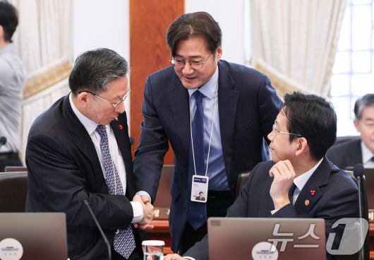 (서울=뉴스1) 허경 기자 = 홍익표 정무수석이 20일 청와대에서 열린 국무회의에서 정성호 법무부 장관과 인사를 나누고 있다. 2026.1.20/뉴스12expulsion@news1.krCopyright ⓒ 뉴스1. All rights reserved. 무단 전재 및 재배포, AI학습 이용 금지.