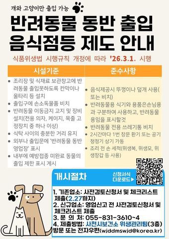 ‘반려동물 동반 출입 음식점’은 식품위생법 시행규칙 개정에 따라 3월 1일부터 시행되는 제도로 일반음식점·휴게음식점·제과점 등이 대상이다.