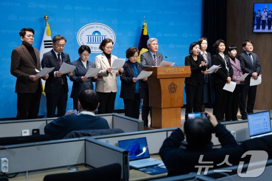 (서울=뉴스1) 유승관 기자 = 서왕진 조국혁신당 원내대표를 비롯한 의원단이 20일 서울 여의도 국회 소통관에서 '중수청·공소청법 민주당에게 묻는다' 긴급 기자회견을 하고 있다. 2026.1.20/뉴스1