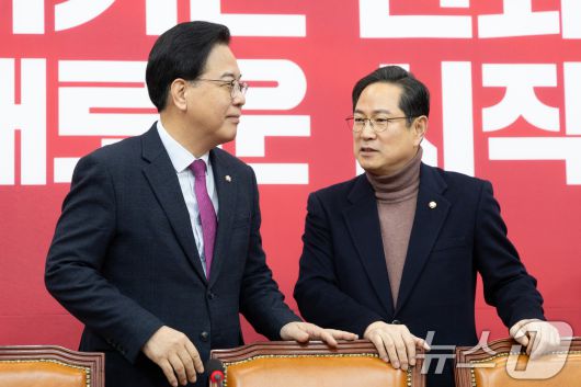 (서울=뉴스1) 이승배 기자 = 송언석 국민의힘 원내대표가 20일 서울 여의도 국회에서 열린 원내대책회의에서 박수영 의원과 대화하고 있다. 2026.1.20/뉴스1photolee@news1.krCopyright ⓒ 뉴스1. All rights reserved. 무단 전재 및 재배포, AI학습 이용 금지.