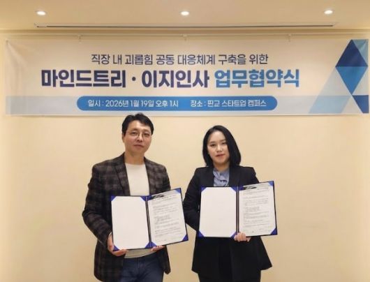 HR·노무 컨설팅 기업 (주)이지인사(대표 정보람)와 심리·조직 컨설팅 전문기업 (주)마인드트리(대표 황필수)가 19일 직장 내 괴롭힘 예방 및 대응 체계 강화를 위한 업무협약(MOU)을 체결했다.