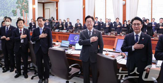 (서울=뉴스1) 허경 기자 = 이재명 대통령이 20일 청와대에서 열린 국무회의에서 국민의례를 하고 있다. 2026.1.20/뉴스1