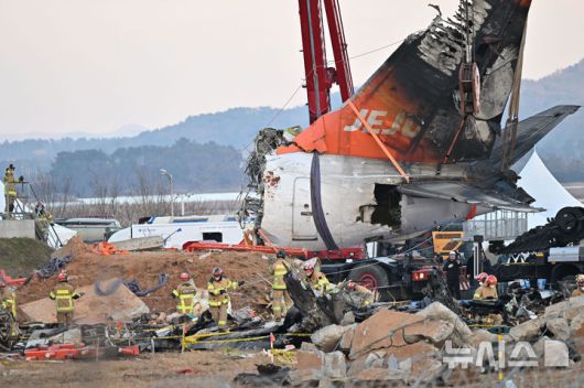 [무안=뉴시스] 이영주 기자 = 제주항공 참사 엿새째인 3일 오후 전남 무안군 무안국제공항에서 사고 여객기가 기중기를 통해 들어올려지고 있다. 2025.01.03. leeyj2578@newsis.com |