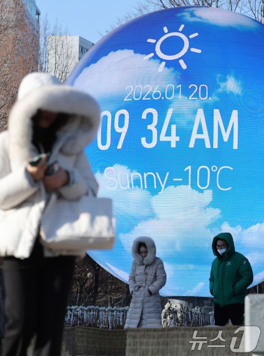 (서울=뉴스1) 박지혜 기자 = 20일 서울 송파구 미디어아트 조형물인 ‘더 스피어’에 표시된 실시간 온도가 영하 10도를 나타내고 있다. 기상청은 당분간 북쪽에서 찬 공기가 내려오면서 낮 기온도 영하권에 머무는 추운 날씨가 이어질 것으로 전망했다. 2026.1.20/뉴스1