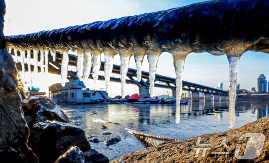 (서울=뉴스1) 이호윤 기자 = 한파주의보가 발효된 20일 서울 광진구 인근 한강에 고드름이 얼어있다. 기상청은 이날부터 전국 대부분 지역에서 아침 기온이 전날보다 10도 이상 크게 떨어지는 곳이 많겠다며 당분간 강한 추위가 지속되겠다고 예보했다. 2026.1.20/뉴스1