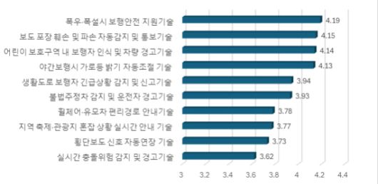 연구원이 도민 1000명을 대상으로 설문조사를 한 결과, 도민들은 보행 안전을 매우 중요하게 생각하지만 현재의 안전 개선 수준에는 만족도가 높지 않은 것으로 나타났다. 도민들이 가장 필요하다고 꼽은 AI 기술은 △'폭우나 폭설 시 보행 안전 지원 기술'(4.19점/5점 만점)이었으며 △'망가진 보도블록 자동 감지'(4.15점) △'어린이 보호구역 내 위험 경고'(4.14점) 등이 그 뒤를 이었다.