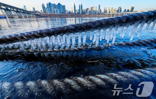 (서울=뉴스1) 이호윤 기자 = 한파주의보가 발효된 20일 서울 광진구 인근 한강에 고드름이 얼어있다. 기상청은 이날부터 전국 대부분 지역에서 아침 기온이 전날보다 10도 이상 크게 떨어지는 곳이 많겠다며 당분간 강한 추위가 지속되겠다고 예보했다. 2026.1.20/뉴스1
