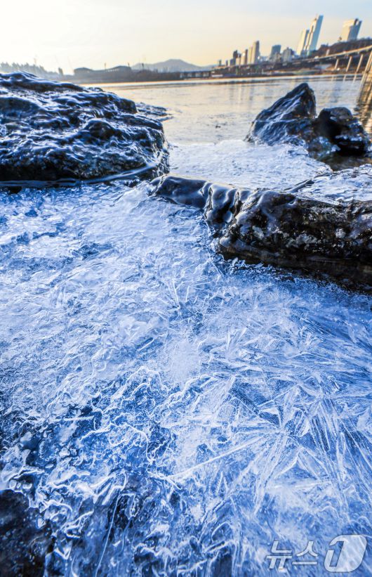 (서울=뉴스1) 이호윤 기자 = 한파주의보가 발효된 20일 서울 광진구 인근 한강이 얼어있다. 기상청은 이날부터 전국 대부분 지역에서 아침 기온이 전날보다 10도 이상 크게 떨어지는 곳이 많겠다며 당분간 강한 추위가 지속되겠다고 예보했다. 2026.1.20/뉴스1
