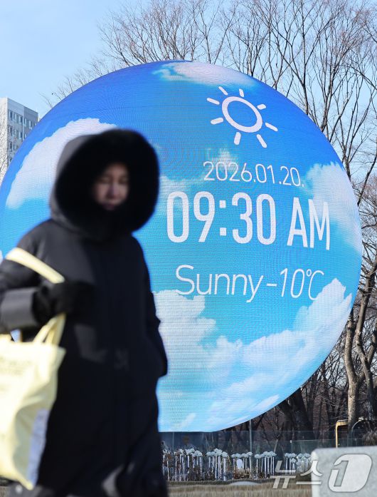 (서울=뉴스1) 박지혜 기자 = 20일 서울 송파구 미디어아트 조형물인 ‘더 스피어’에 표시된 실시간 온도가 영하 10도를 나타내고 있다. 기상청은 당분간 북쪽에서 찬 공기가 내려오면서 낮 기온도 영하권에 머무는 추운 날씨가 이어질 것으로 전망했다. 2026.1.20/뉴스1