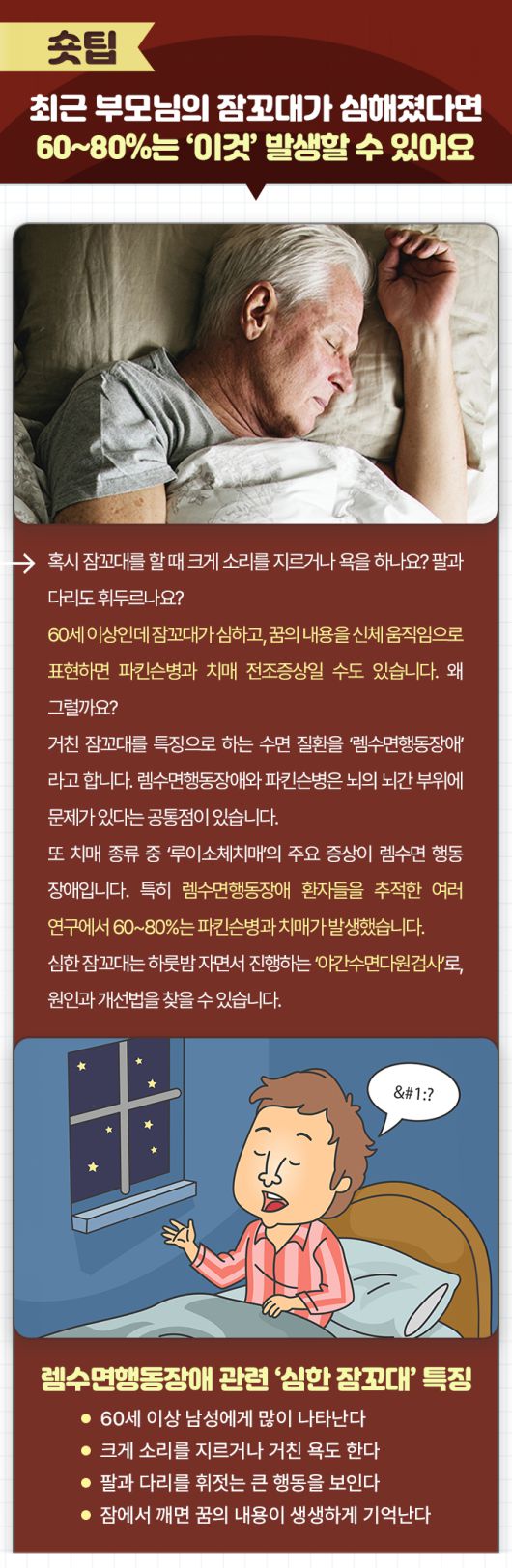 60세 이상인데 잠꼬대가 심하고, 꿈의 내용을 신체 움직임으로 표현하면 파킨슨병과 치매 전조증상일 수도 있습니다. 왜 그럴까요?