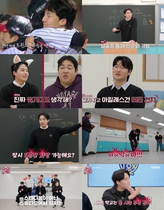 티빙 오리지널 예능‘야구기인 임찬규’가 19일공개된2화에서 어디서도 본 적 없는‘멘탈 강화 클래스’를 선보이며 이용자들에게 큰 웃음을 안겼다. / 티빙 |