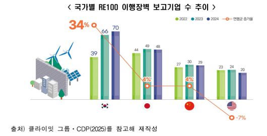 반면 미국·일본·중국 등 주요국에서는 같은 기간 RE100 이행 장벽을 보고한 기업 수가 감소하거나 정체된 것으로 나타났다. 국내 기업 가운데 재생에너지 조달에 어려움을 겪는 이유로는 비용 부담을 꼽은 응답이 51.4%로 가장 많았다.