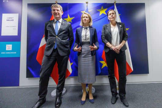 | 포울센 덴마크 국방장관(왼쪽)과 모츠펠트 그린란드 외교장관(오른쪽)이 19일(현지시간) 브뤼셀에서 칼라스 EU 외교안보 고위대표를 만났다 / 사진=연합뉴스 |