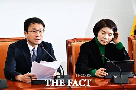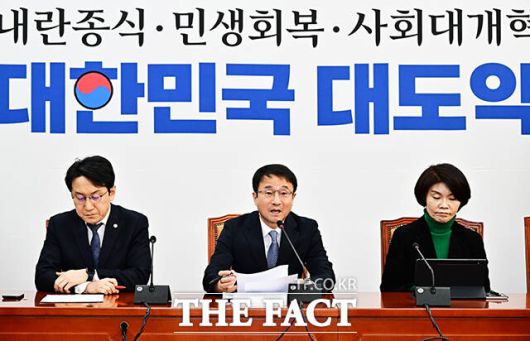 [더팩트ㅣ국회=배정한 기자] 한병도 더불어민주당 원내대표(가운데)가 20일 오전 서울 여의도 국회에서 열린 원내대책회의에 참석해 모두발언을 하고 있다.