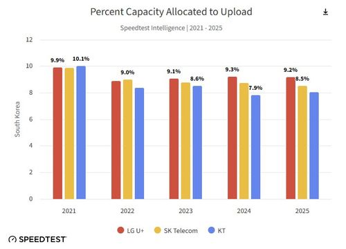 반면 미국 통신사인 버라이즌(7.1%), T-모바일(6.7%), AT&T(6.6%) 등은 한국보다도 낮은 수준을 기록하며 다운로드 편중 현상이 가장 심한 것으로 나타났다.