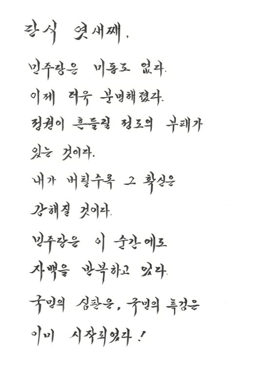 그는 “내가 버틸수록 그 확신은 강해질 것”이라며 “민주당은 이 순간에도 자백을 반복하고 있다. 국민의 심판은, 국민의 특검은 이미 시작됐다”고 썼다.