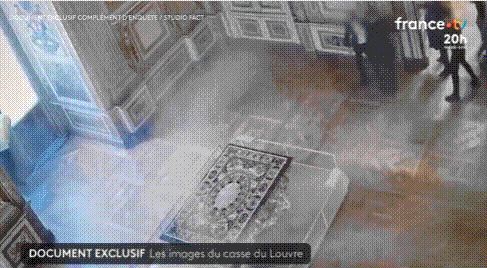 프랑스 TF1과 프랑스 TV 방송이 18일 공개한 박물관 내부 방범 카메라 영상을 보면, 범행 당일 오전 9시 34분 첫 번째 절도범이 창문을 부수고 왕실 보석 전시실인 아폴론 갤러리 안으로 침입한다.