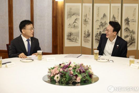 [서울=뉴스핌] 김민석 국무총리가 20일 서울 종로구 삼청동 총리공관에서 박상진 산업은행 회장을 면담하고, 최근 주요산업 업황 및 우리경제의 성장잠재력 제고를 위한 정책금융 지원 계획에 대한 의견을 교환하고 있다. [사진=총리실] 2026.01.20
