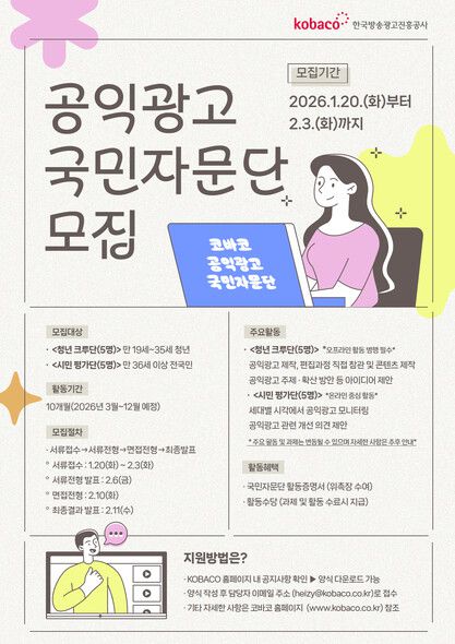 한국방송광고진흥공사(코바코)는 공익광고 제작에 국민의 참여와 소통을 확대하기 위해 ‘2026년 공익광고 국민자문단’을 20일부터 다음달 3일까지 모집한다.