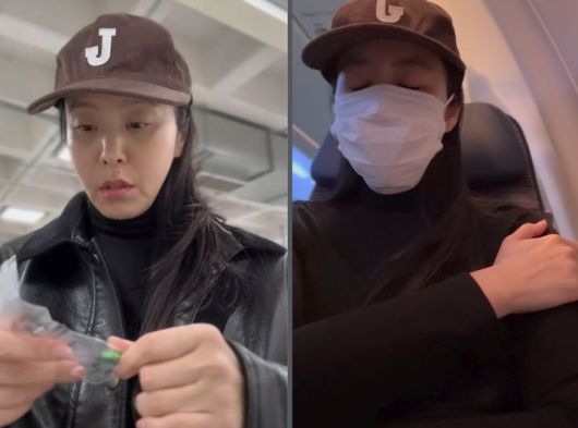 공개된 영상에는 모자를 쓴 박지윤이 약을 먹는 모습과 마스크를 착용한 채 비행기 좌석에 앉아 있는 모습 등이 담겼다.