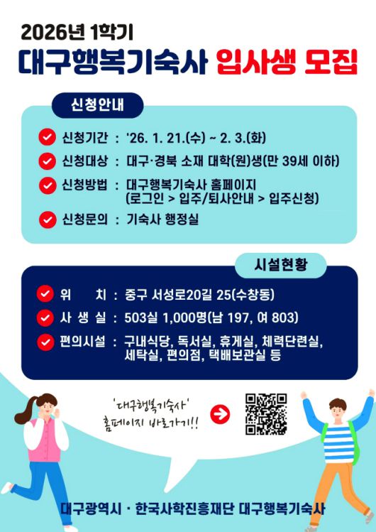 아시아투데이 배철완 기자 = 대구시는 한국사학진흥재단 대구행복기숙사(중구 수창동)에 입주할 2026학년도 1학기 신규 입사생을 오는 21일부터 2월 3일까지 모집한다고 밝혔다.
