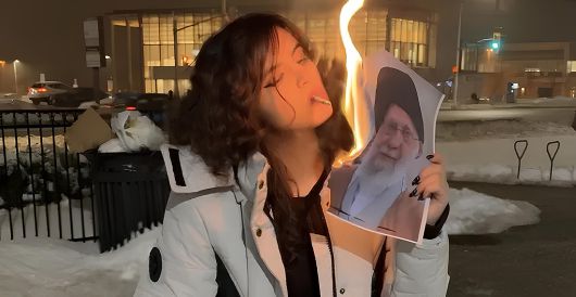 ‘모티시아 아담스’라는 예명을 쓰는 이란 난민 여성이 이란 최고지도자 아야톨라 알리 하메네이의 사진에 불을 붙인 뒤 담배에 옮겨 붙이고 있다. 모티시아 아담스 엑스 계정 |